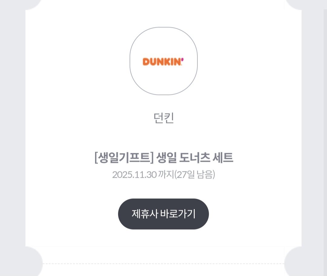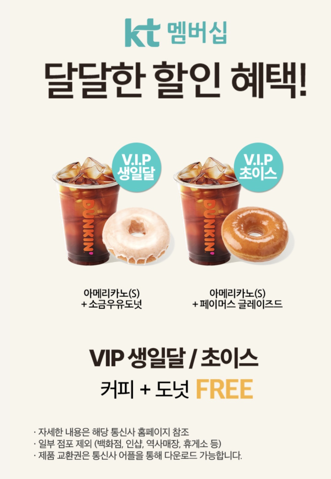 KT 멤버십 VIP 등급이라면 생일쿠폰 그냥 흘려보내지 마시고 가까운 던킨 매장에서 도넛과 커피 무료로 드시기 바랍니다.
