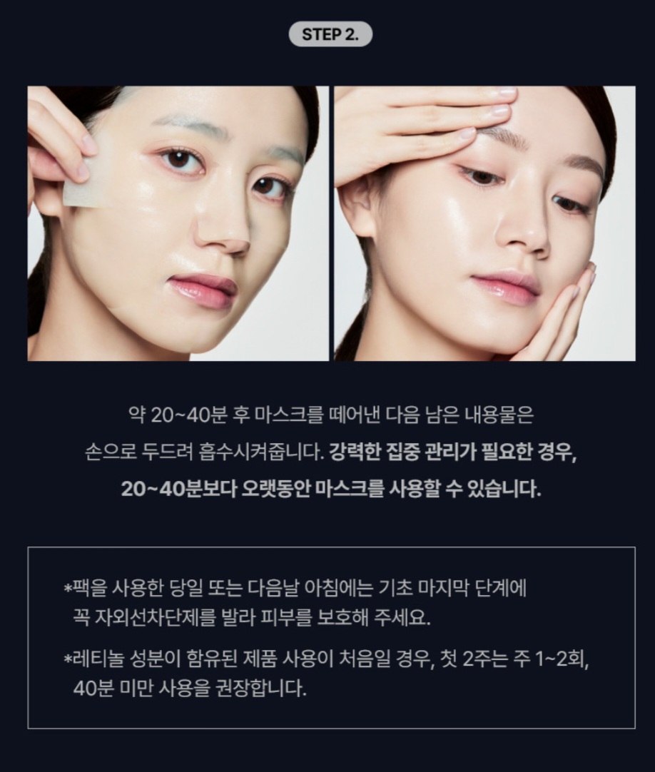 * 팩을 사용한 당일 또는 다음날 아침에는 기초 마지막 단계에 꼭 자외선 차단제를 발라주세요.