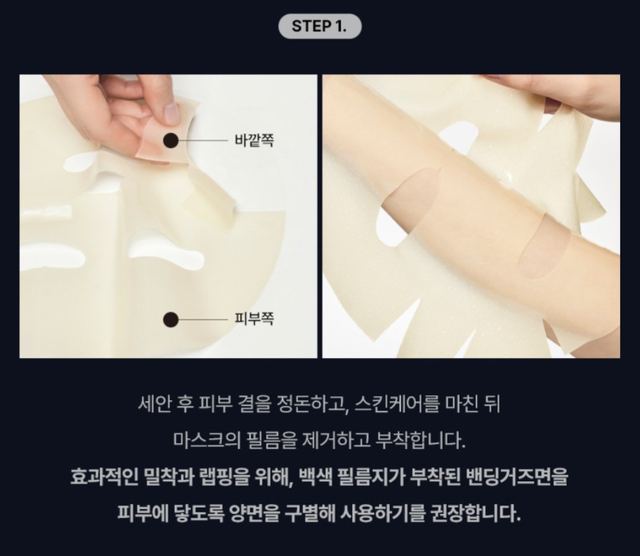 사용법은 세안 후 토너나 스킨으로 피부결을 정리하고 하이드로겔마스크팩을 부착해 관리합니다.